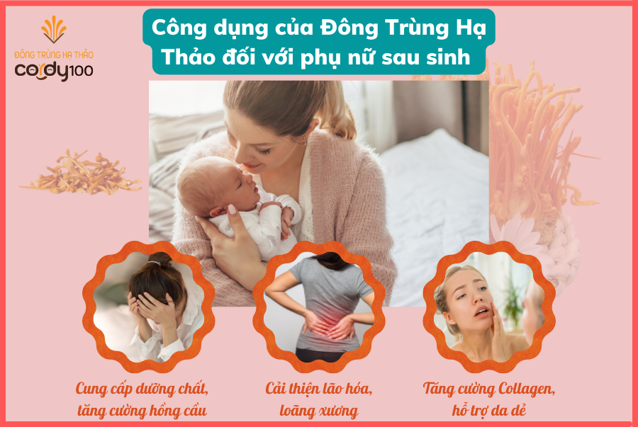 Sau sinh, các bà mẹ rất dễ rơi vào trạng thái suy nhược cơ thể, mệt mỏi và chân tay đau nhức. Sử dụng Đông Trùng Hạ Thảo giúp kích thích hệ miễn dịch tự nhiên. Từ đó, giúp giải quyết vấn đề suy nhược cơ thể. Đồng thời giảm các vấn đề thuogwf gặp sau sinh. Trẻ sơ sinh khi bú sữa mẹ sử dụng Đông Trùng Hạ Thảo sẽ có sức đề kháng tốt hơn.